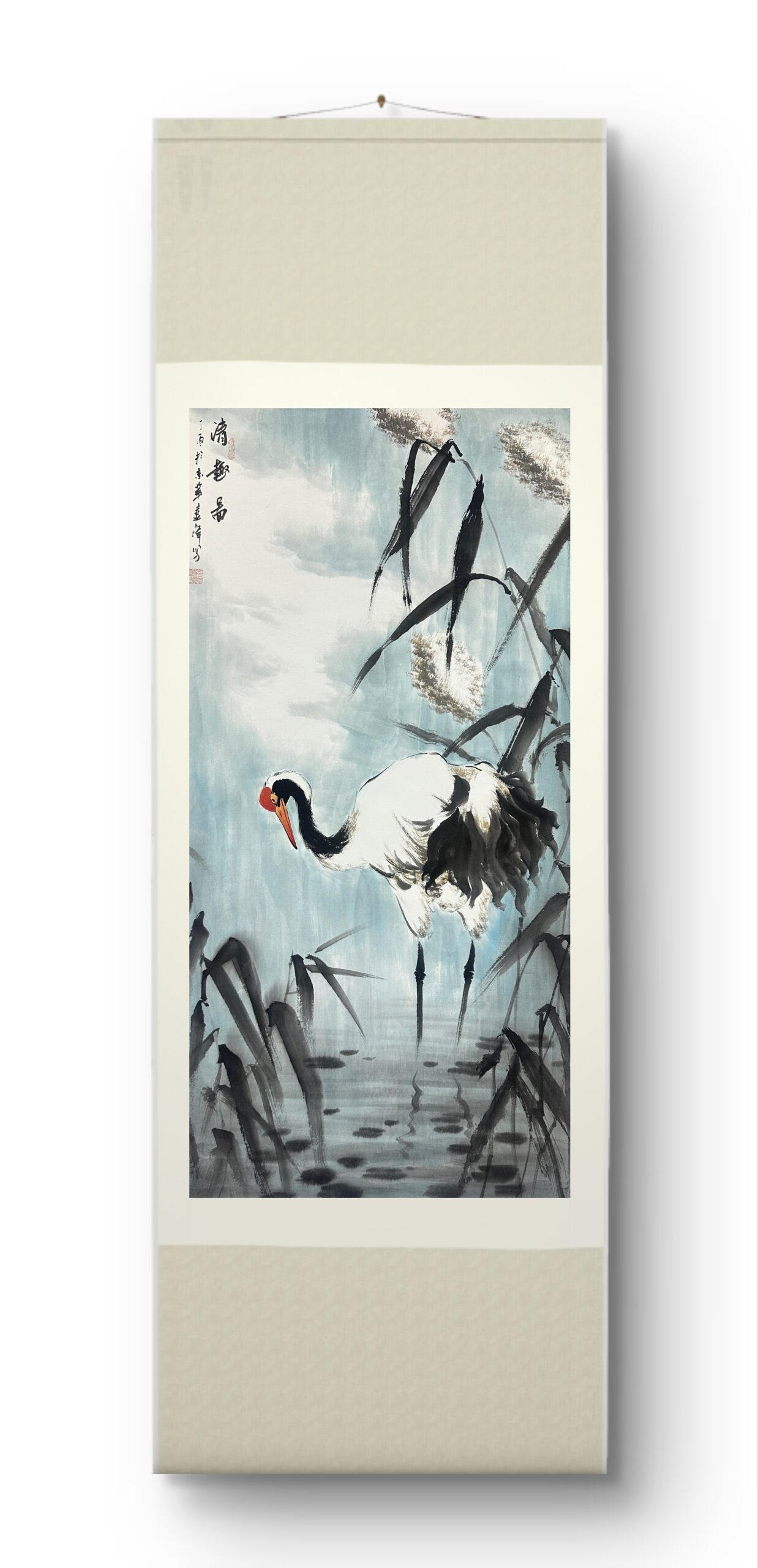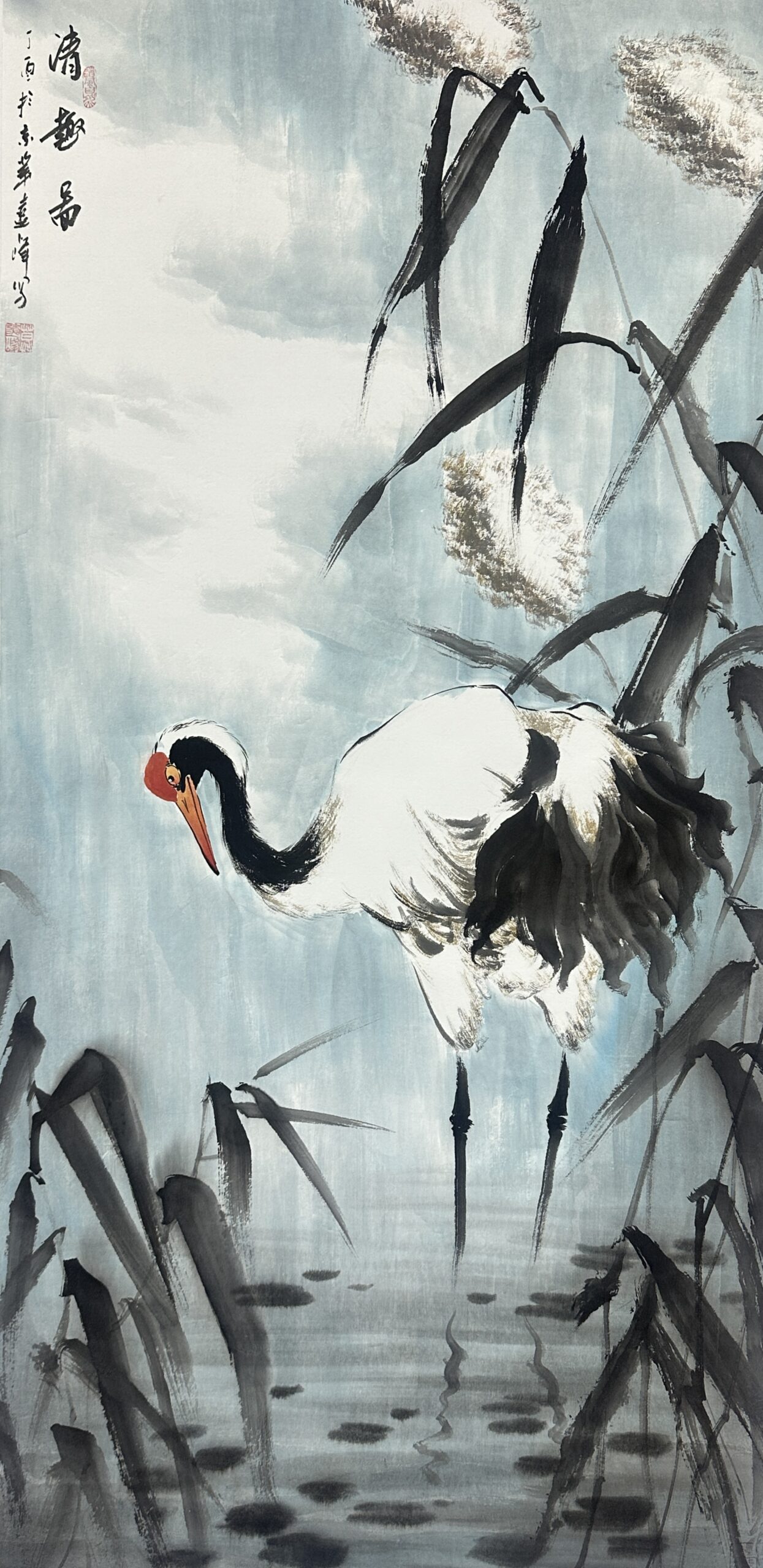 This traditional Chinese ink – wash painting showcases a crane standing gracefully amidst reeds by the water. The light blue – white background, like a hazy sky or tranquil water surface, creates a serene atmosphere. The crane, with its black – and – white plumage and bright red beak, becomes the focal point, exuding elegance and nobility. The reeds, painted with bold and free ink lines, add a sense of natural wildness. Together, they present a peaceful and poetic scene typical of Chinese traditional art, reflecting the pursuit of harmony between nature and life.